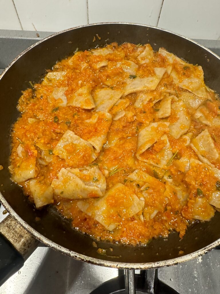 Les maltagliati complets sans œufs peuvent être assaisonnés avec n’importe quelle sauce. J’ai réalisé mon faux ragù mais sans vin et j’ai sauté les maltagliati dans la poêle avec un peu d’eau de cuisson.