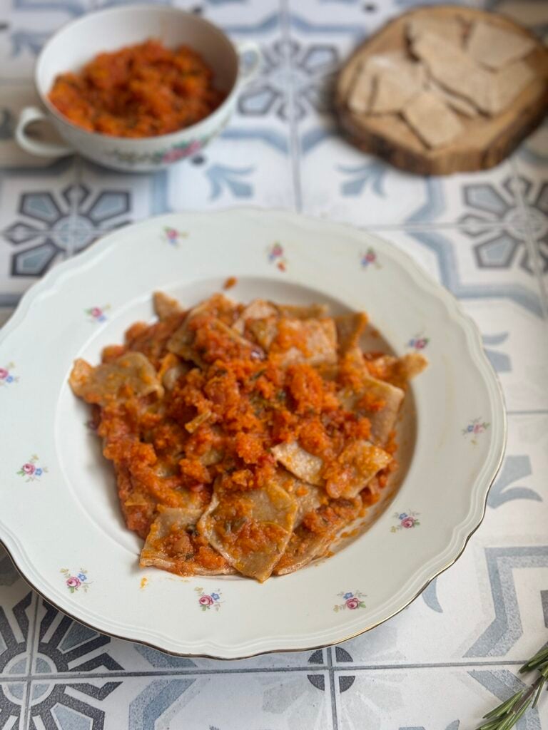 Chez moi, on ne faisait pas très souvent des pâtes fraîches. L’une des choses que nous faisions le plus souvent étaient ces maltagliati sans œufs, coupés de manière libre. J’ai décidé de varier la recette de ma mère en les réalisant avec des farines plus rustiques. C’est ainsi que sont nés les maltagliati complets sans œufs, des pâtes très faciles à faire et très rustiques, capables d’adhérer à la sauce pour un goût explosif. Il vous suffira d’un bol, d’une louche, d’un couteau et d’une planche à découper pour les réaliser ! Venez pétrir avec moi !