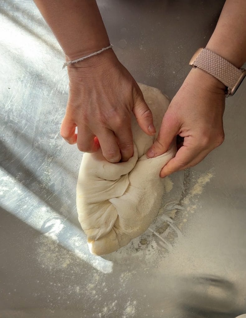 Une fois tous les bords scellés, roulez la pâte sur elle-même pour former une boule. Veillez à bien sceller la pâte, afin d’éviter des défauts dans la forme finale de la boule.