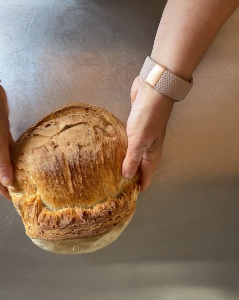 Une fois le temps de cuisson écoulé, sortez le pain du four et laissez-le refroidir debout, afin de laisser l’humidité intérieure s’échapper. Et voilà : votre Pan de pueblo, le pain de campagne espagnol, est prêt à être dégusté !Si vous souhaitez essayer le Pan de pueblo sans gluten, je vous recommande la version de ma collègue, qui utilise un levain de farine de riz. Vous pouvez trouver sa recette complète ICI