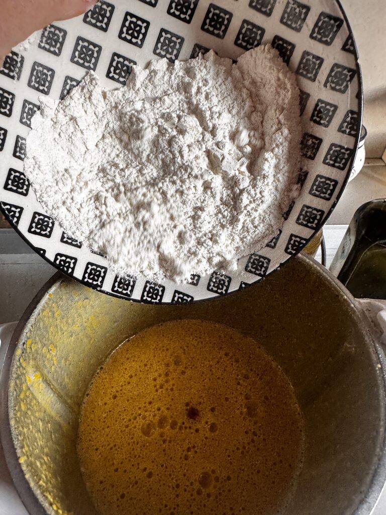 À la fin des farines, la pâte sera prête. Si elle est trop liquide, il suffira d’ajouter une cuillère de farine.
