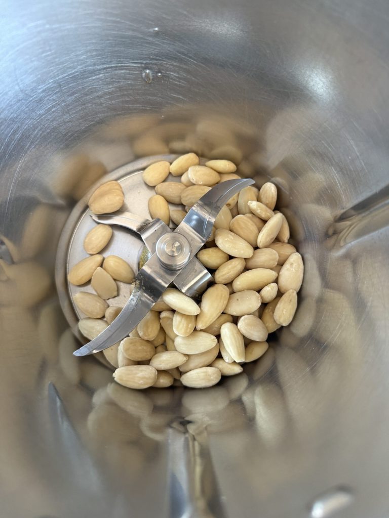 Dans le Bimby, verser les amandes et les hacher jusqu’à les pulvériser à vitesse 7 pendant 15 secondes.