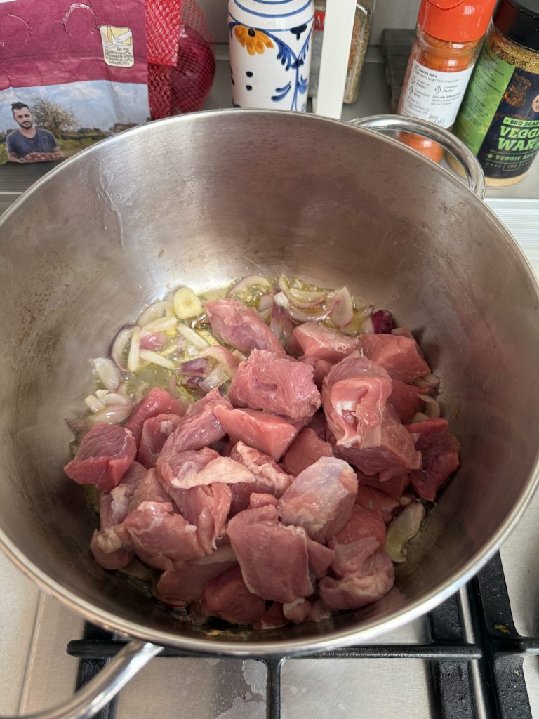 Ajoute dans la casserole la viande, préalablement coupée en dés réguliers, et mélange bien pour l’amalgamer aux aromates.