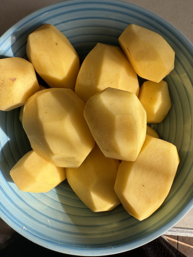 Lave, épluche et coupe les pommes de terre en petits morceaux réguliers, pour qu’elles cuisent uniformément et se mélangent bien à la sauce du ragoût de veau avec pommes de terre à la florentine.