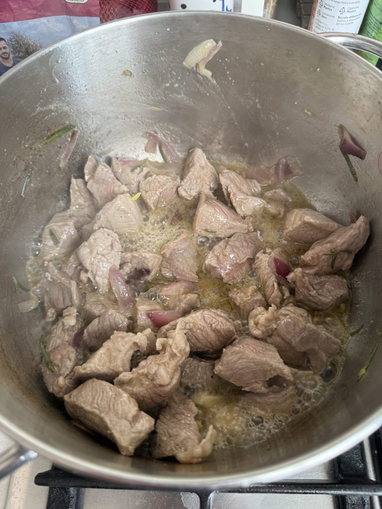 Ajoute le romarin frais et mélange, puis ajuste le sel et le poivre. C’est l’une des étapes les plus délicates : la viande doit saisir bien, en retenant ses sucs, mais sans coller au fond. Le ragoût sera prêt pour l’étape suivante lorsque l’eau libérée par la viande sera presque totalement évaporée.