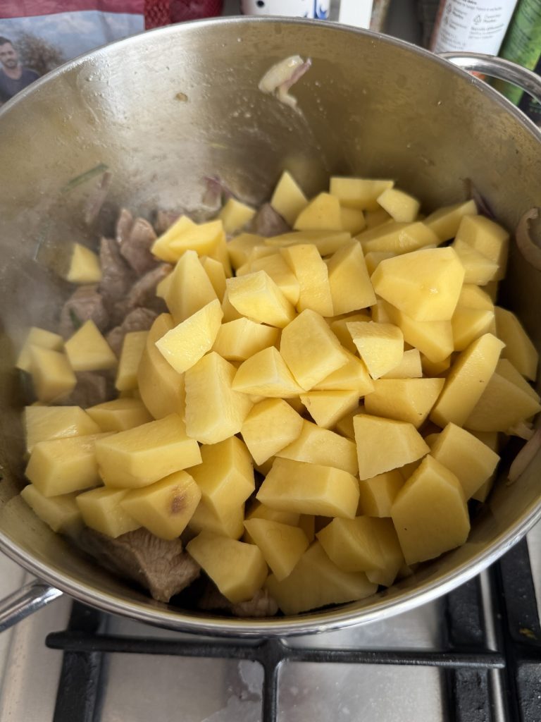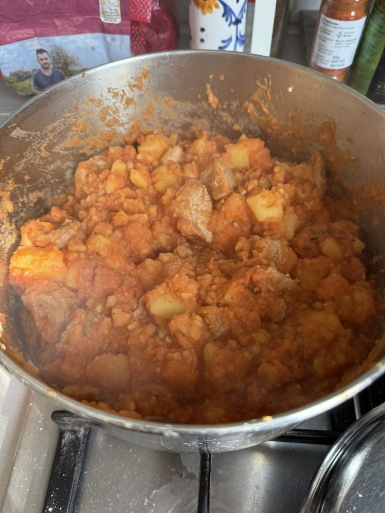 Lorsque les pommes de terre seront tendres et presque effritées et la viande tendre, découvre la casserole et augmente le feu pour faire légèrement sécher le ragoût de veau. À ce stade, le ragoût de Pelliccia est prêt !