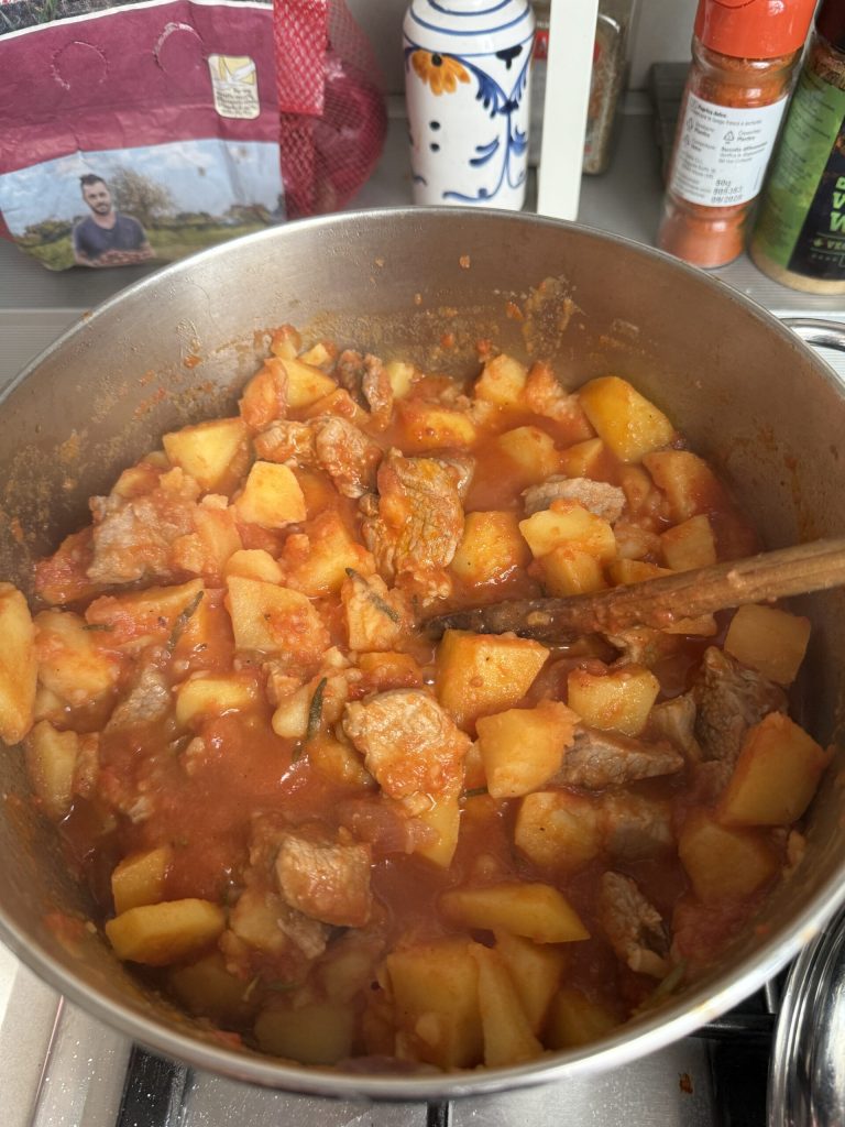 Laisse cuire le ragoût de veau avec pommes de terre à la florentine pendant environ une heure, en remuant de temps en temps. Si la sauce devient trop sèche, ajoute un peu d’eau pour poursuivre la cuisson. Goûte de temps en temps et ajuste le sel et le poivre si nécessaire.