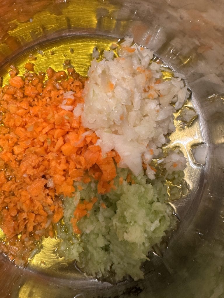 Dans une casserole en acier haute et spacieuse, verser une dose généreuse d’huile avec oignon, carotte et céleri déjà hachés. Le céleri doit toujours être un peu plus que la carotte.