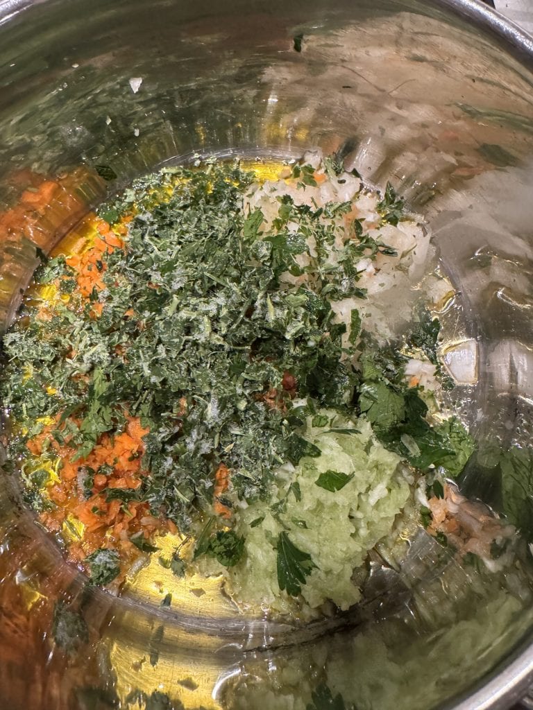 Ajouter ensuite un persil haché abondant. Dans ce cas, j’ai utilisé à la fois du persil frais et congelé, les deux conviennent.
