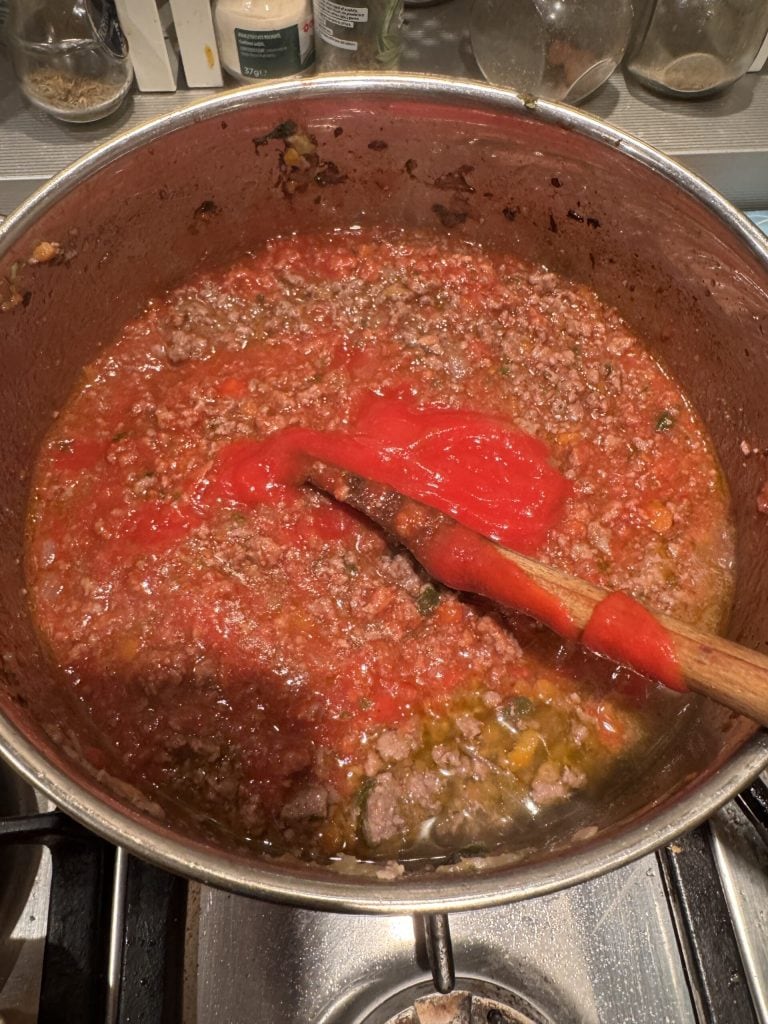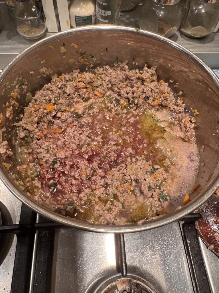 Les ingrédients de ma version du ragoût toscan sont vraiment peu nombreux, en commençant par la viande. Traditionnellement, dans la viande hachée, on met 80% de bœuf et 20% de porc. Mais chez moi, on a toujours utilisé uniquement de la viande bovine. Pour cette raison, elle doit être de haute qualité. Il est bon de préférer la viande hachée choisie ou choisie minutieusement, donc faite avec des morceaux plus « nobles » du bœuf, et de préférence de Chianina ou Fassona. Le vin doit également être assez « corsé » et avoir au moins 13,5/14,5 degrés. J’utilise généralement un Chianti, mais il y a beaucoup d’autres vins régionaux qui conviennent. Évidemment, il ne doit pas être pétillant comme un Lambrusco. En ce qui concerne les autres ingrédients, j’ai essayé de traduire en grammes les indications de ma maman, mais pour l’eau et l’huile, en réalité, il vaut mieux y aller à l’œil et évaluer au fur et à mesure si vous avez besoin d’en ajouter davantage.