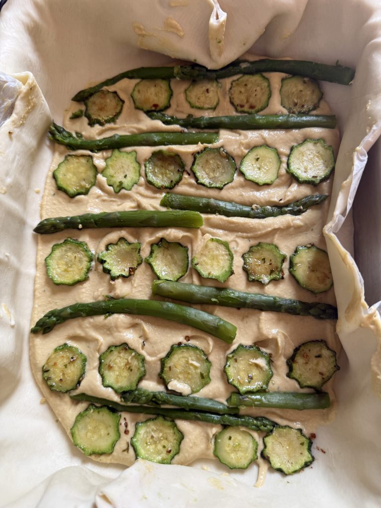 À ce stade, j’ajoute les légumes sur la base de houmous. J’ai créé des bandes alternées de courgettes et asperges, mais vous pouvez les disposer comme vous le souhaitez : de manière ordonnée, libre ou même plus créative et « artistique » que la mienne.