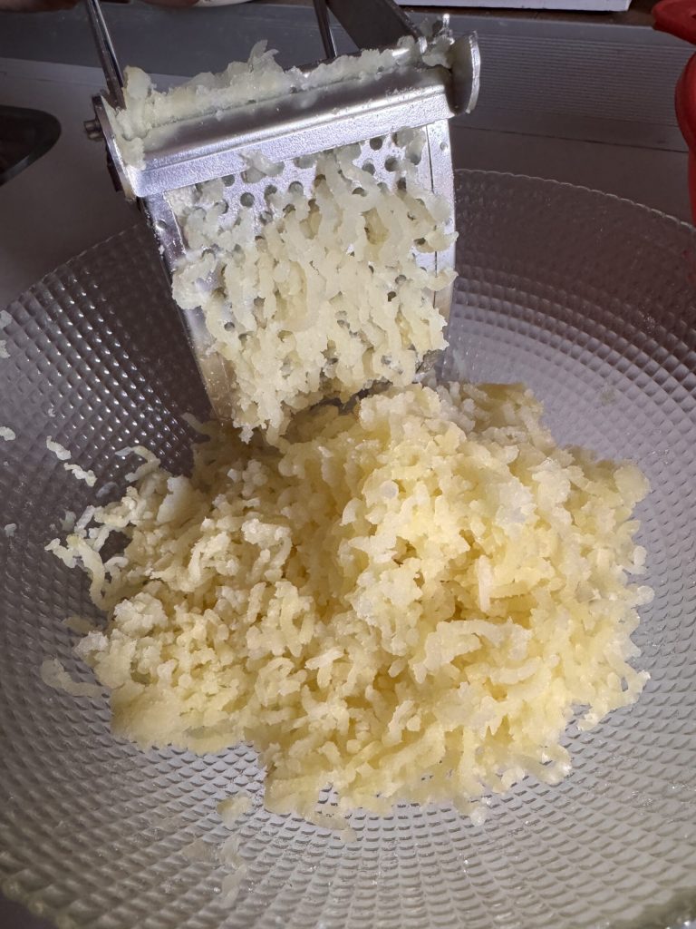 Faire cuire les pommes de terre dans de l’eau salée et les laisser bien refroidir.