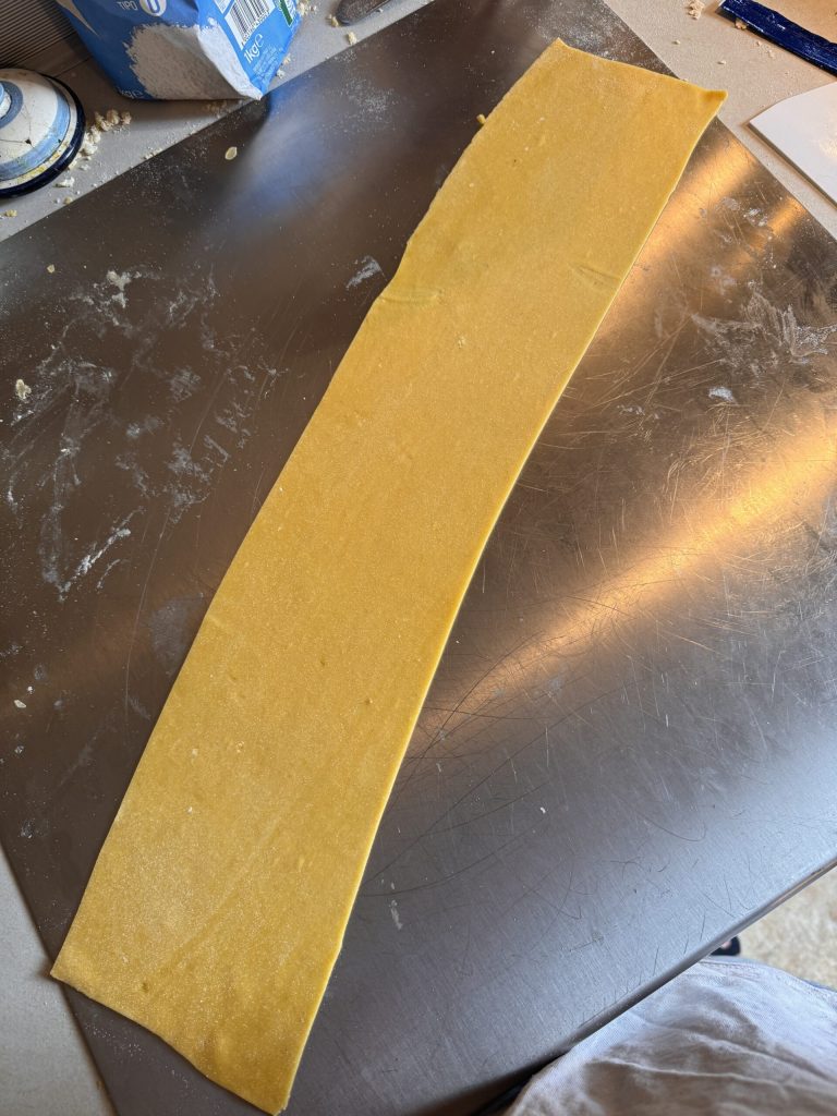 Pour étaler la pâte, on peut utiliser un rouleau et un peu d’huile de coude ou la machine à pâtes, manuelle ou électrique. La pâte doit être fine mais pas trop, car la caractéristique de ces tortelli mugellani de pommes de terre est d’être faits avec une pâte très rustique.