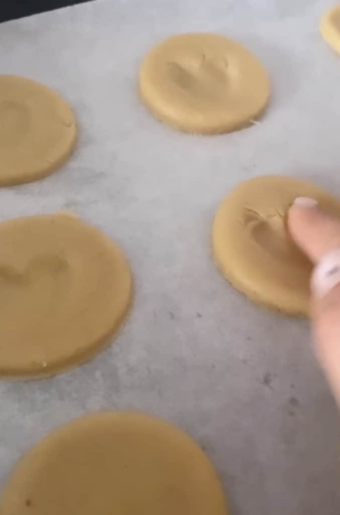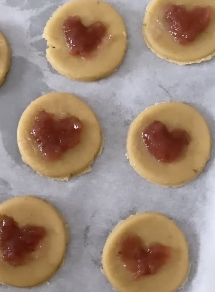 Étalez la pâte sur une plaque en vous aidant de papier sulfurisé, et avec un verre découpez les biscuits. Avec le bout de l’index, formez les cavités à l’intérieur des biscuits et remplissez ces cavités avec une cuillère à café de confiture.