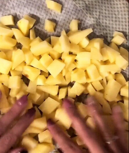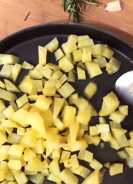 Nous coupons les pommes de terre en dés et les rinçons à l’eau bien froide pendant quelques secondes. Cela sert à leur faire perdre un peu d’amidon et les rendre croustillantes à la cuisson.