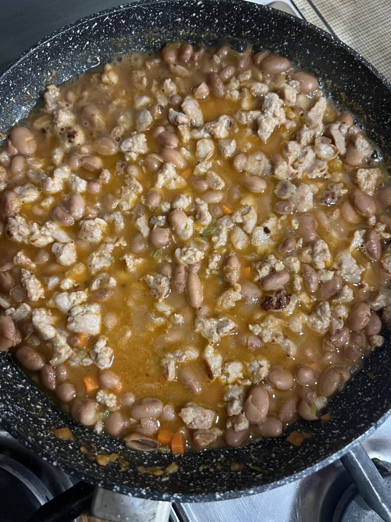 • Dans la poêle, faisons revenir un filet d’huile avec l’oignon émincé, l’ail émincé, le piment et les épices (paprika et coriandre). Maintenant, ajoutons les haricots et faisons-les imprégner de saveur deux minutes avant de verser un demi-verre d’eau chaude et le concentré de tomate.