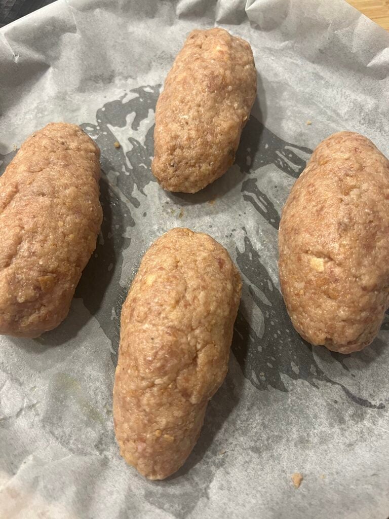 Nous divisons le mélange en 4 parties. Avec les mains, nous les étendons bien et plaçons au centre une tranche de jambon cuit et une lanière de provolone. Avec les mains, nous aidons à refermer le mélange pour former 4 petits boudins.