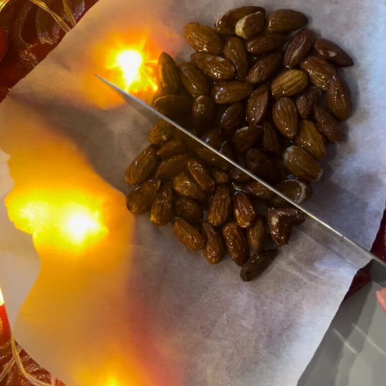 Tu peux utiliser la méthode de grillage que tu préfères. Je les ai grillées au micro-ondes. Dans une plaque, j’ai mis les amandes toutes séparées les unes des autres et j’ai vaporisé un peu d’huile d’olive extra vierge. Puis je les ai mises au micro-ondes à pleine puissance pendant 1 minute. Je les ai ensuite sorties du four, laissées refroidir un peu et répété le processus deux fois.
