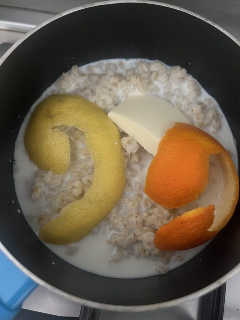 Retirer du feu, enlever les zestes et avec un mixeur plongeant mixer juste une partie du blé. De cette manière, il s’incorporera parfaitement avec la ricotta après, mais nous sentirons quand même toute la texture du blé.