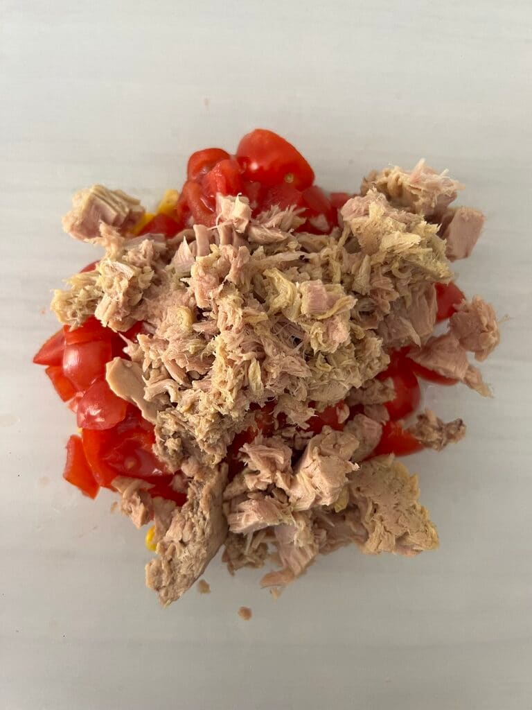Dans un bol, coupons les tomates cerises en morceaux, ajoutons le maïs, le thon égoutté et les olives. Assaisonnons de sel et d’huile et mélangeons.