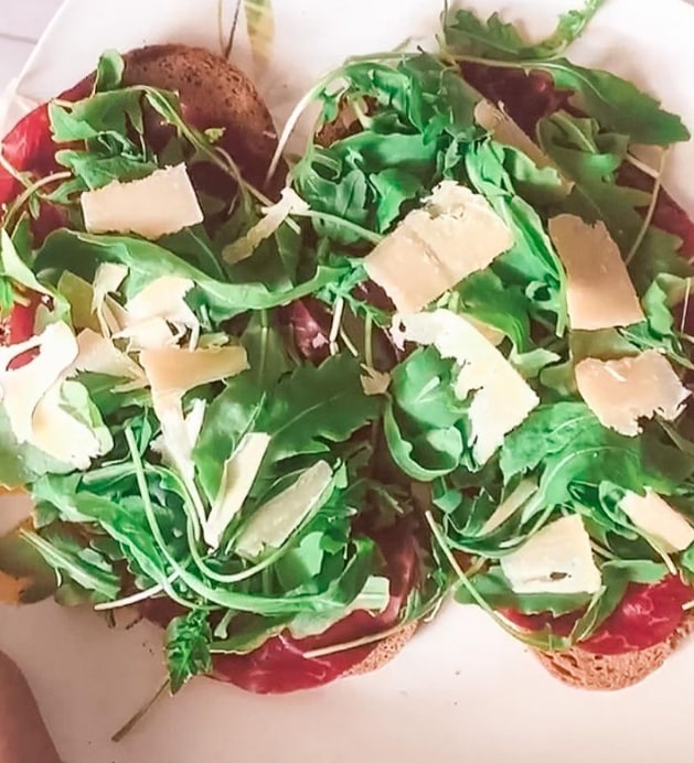 • Grillons le pain de seigle sur le gril. Composons avec tranches de bresaola, roquette, copeaux de parmesan et un filet d’huile.