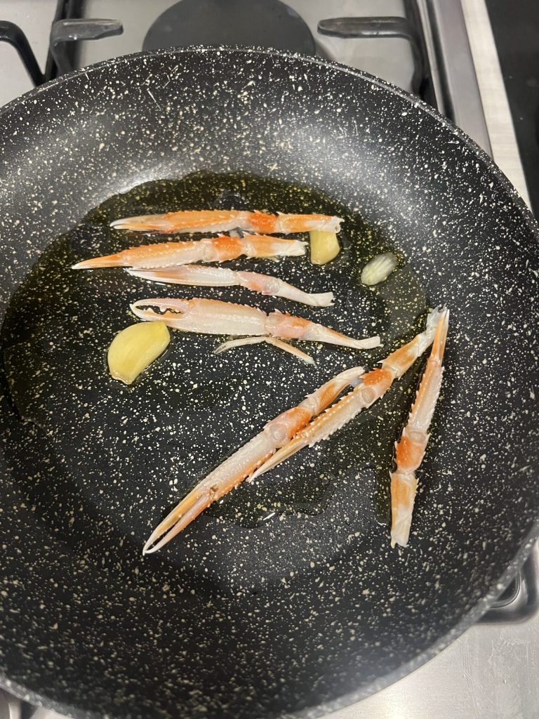 Faisons sauter les langoustines dans la poêle pendant quelques minutes en couvrant avec le couvercle. Une fois cuites, réservons les langoustines, enlevons l’ail et les pinces et gardons la poêle.