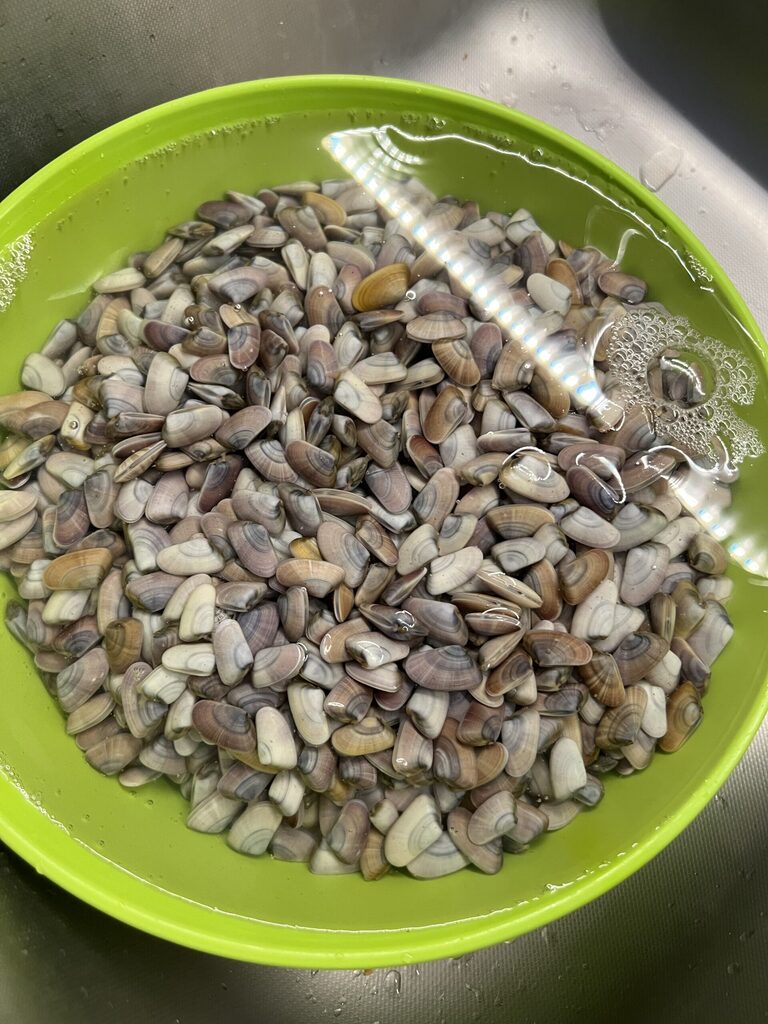 Tout d’abord, prenons soin de nos tellines. Si elles sont pêchées à la main, elles doivent être conservées dans l’eau de mer et laissées pour environ deux heures pour purger. Après ce temps, nous les rinçons bien sous l’eau courante.