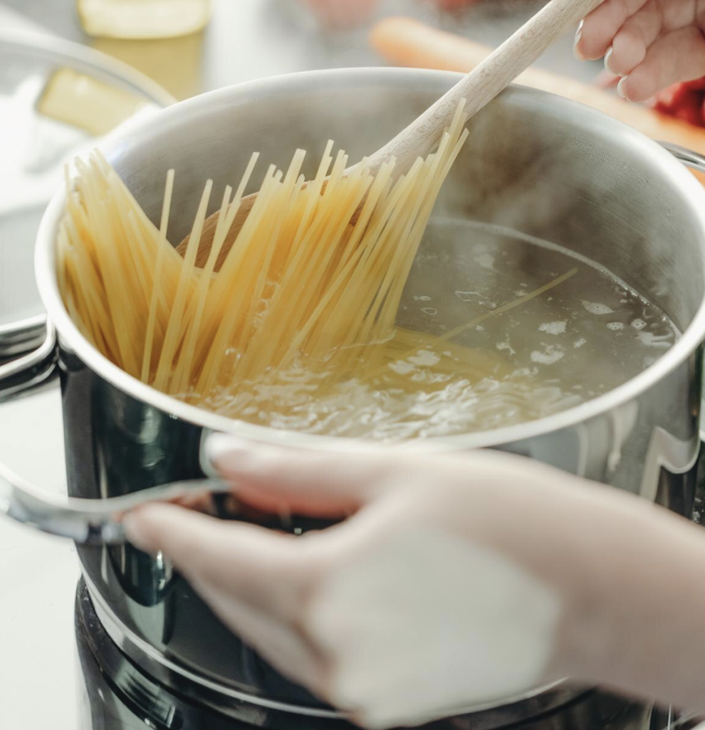 Commençons par faire bouillir l’eau pour les pâtes. À ébullition, salez l’eau et mettez les spaghetti. Nous ferons tout durant ce laps de temps.