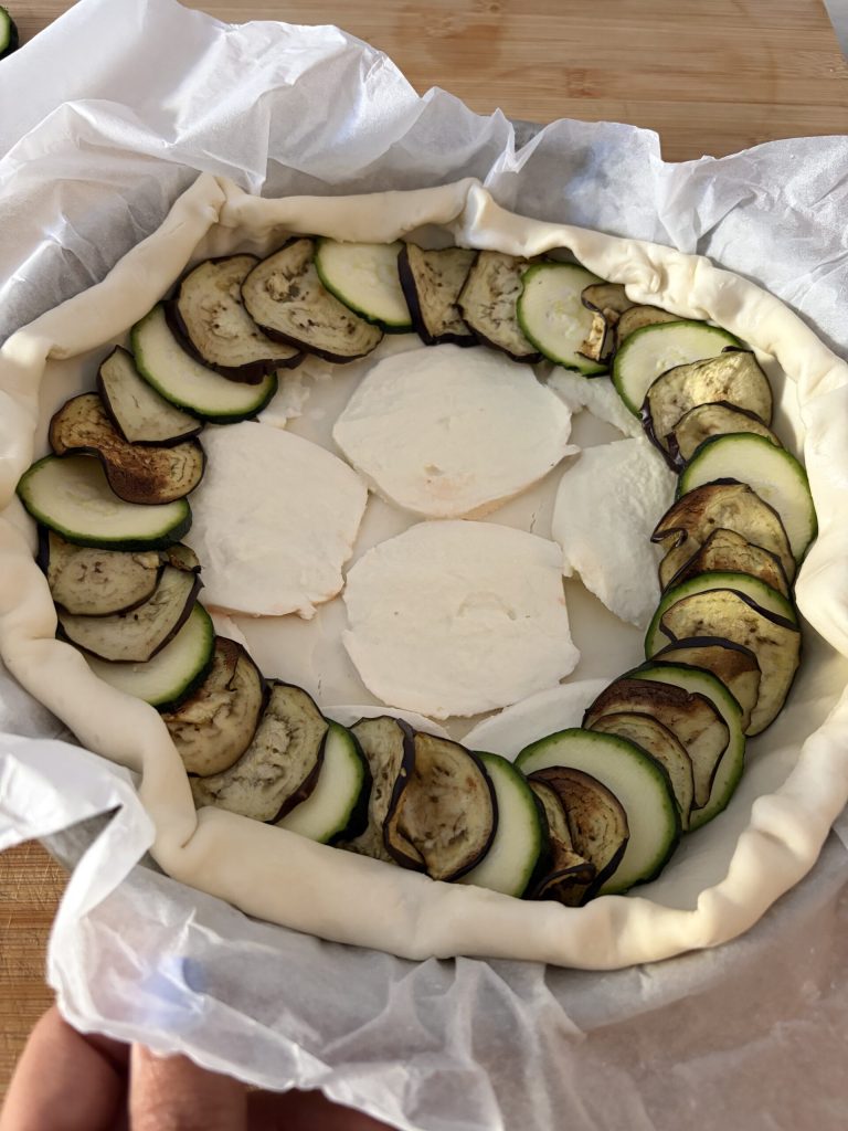 • Déroule la pâte feuilletée et place-la dans un moule avec sa feuille de cuisson. Pique légèrement le fond avec une fourchette. Replie un peu les bords pour former un « rebord ». Couvre le fond avec la provola en fines tranches et commence à disposer les légumes en les superposant et en alternant les rondelles.
