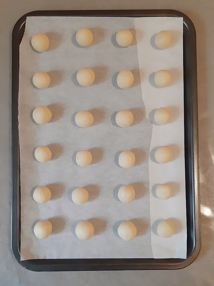 Une fois le temps de repos écoulé, formez des petites boules, légèrement plus grandes qu’une noisette ; déposez-les sur une plaque de cuisson recouverte de papier sulfurisé en les espaçant ; mettez-les au frigo jusqu’à ce que le four soit à température.