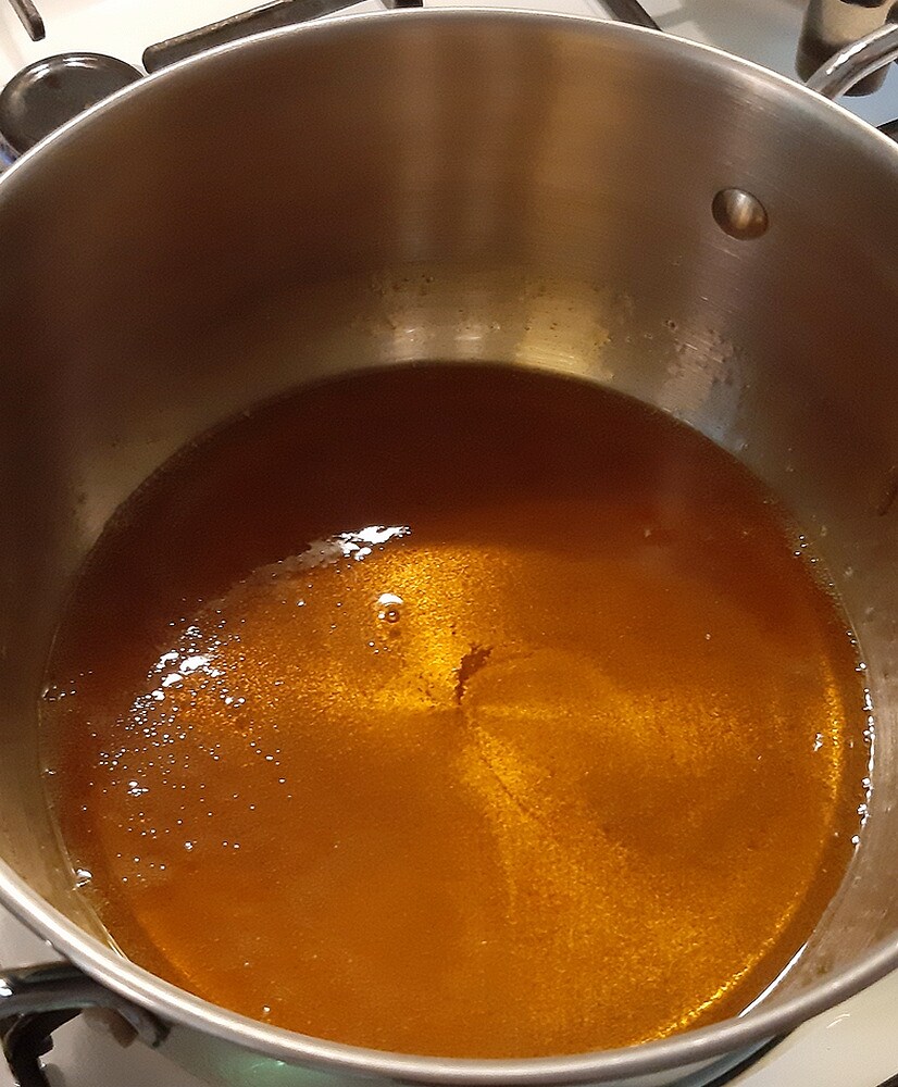 • Quand le sucre sera fondu et commencera à prendre de la couleur faites chauffer dans une petite casserole ou dans la bouilloire 150 g d’eau (elle doit être bouillante).