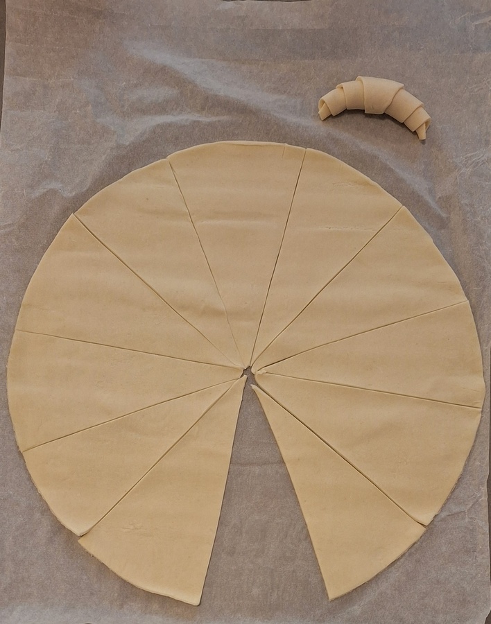 Si vous utilisez une pâte feuilletée ronde, vous pouvez obtenir 12 ou 24 croissants en les découpant avec le couteau à pizza de l’extérieur vers l’intérieur comme sur la photo jointe.
