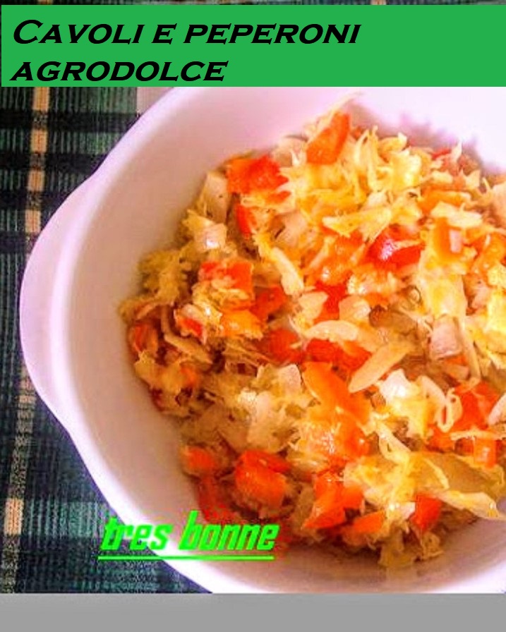 Choux et poivrons aigre-doux est un accompagnement savoureux qui se prépare en peu de temps. On peut l’apprécier sûrement aussi avec des pommes de terre bouillies assaisonnées à part ou mélangées ensemble. À déguster avec du bon pain frais de campagne. Le chou blanc, qui nous fait tant de bien, riche en fibres et avec peu de calories, est un allié pour ceux qui suivent un régime amaigrissant. Il contient des acides gras, dont les oméga 3 et oméga 6, qui aident et favorisent la circulation sanguine, protégeant ainsi le cœur et les artères. Les poivrons, qui contiennent de la vitamine A, sont riches en potassium et en carotène, surtout les rouges. Ils nous aident à avoir une belle peau, à prévenir les cancers et sont également utiles, grâce aux fibres qu’ils contiennent, pour garder le poids sous contrôle. Les poivrons ont une saveur intense qui nous fait apprécier le chou blanc autrement fade.