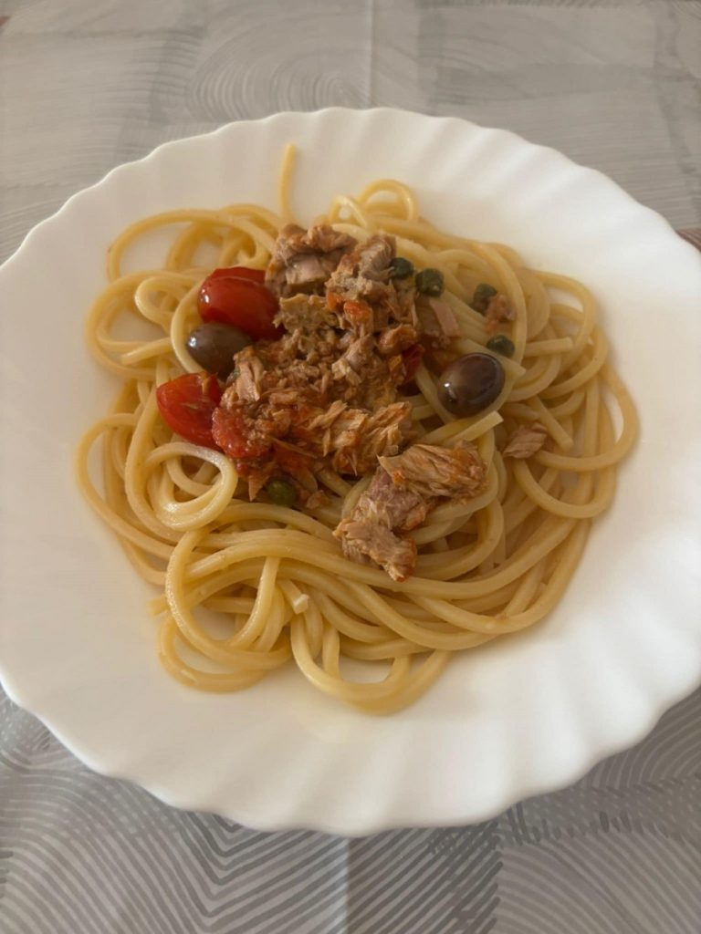 Attendre qu’ils se défassent et ajouter le thon égoutté avec les autres ingrédients, tomates cerises, purée de tomate, olives noires, câpres et un peu de piment fort.