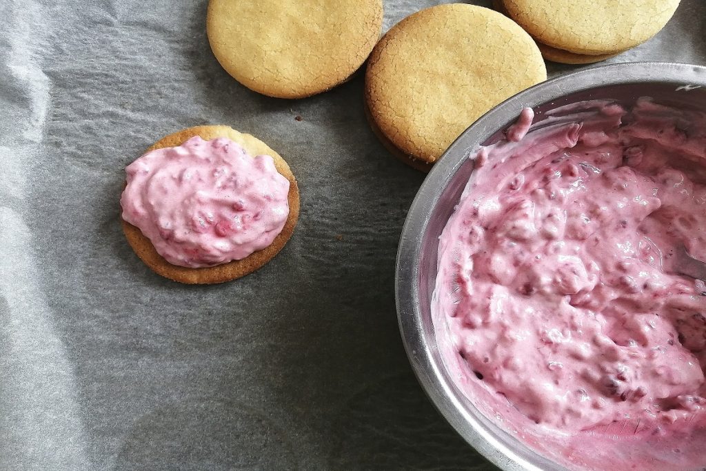 Les biscuits ont au milieu une garniture préparée avec du yaourt grec et des framboises fraîches, recouverts d’un glaçage au chocolat noir et de brisures de pistache pour décorer.
