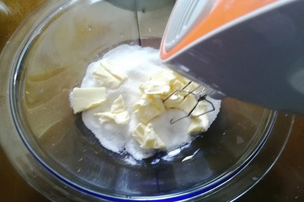 Dans un bol, versez le sucre et le beurre ramolli, travaillez-le avec les fouets.