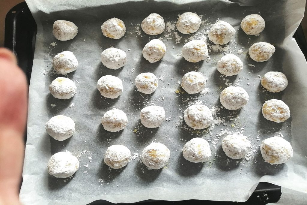 Après le temps de repos, préchauffez le four à 170°C et, en attendant, roulez les boules dans le sucre glace.