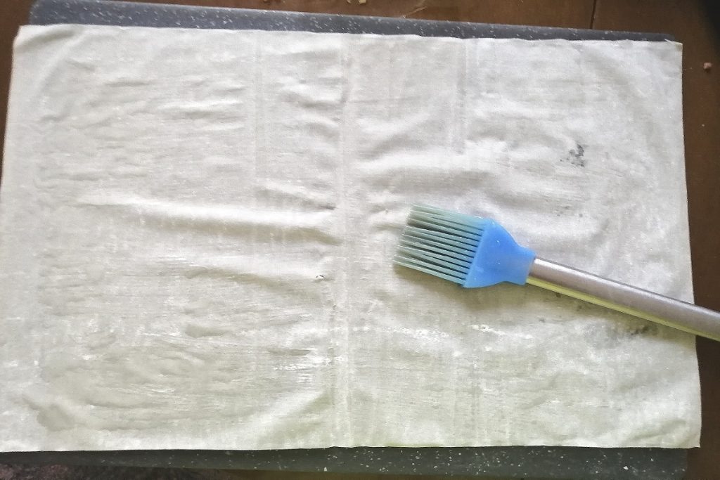 • Commençons à former la base avec les feuilles de pâte filo, en badigeonnant chaque couche d’huile au fur et à mesure que nous posons la suivante.
