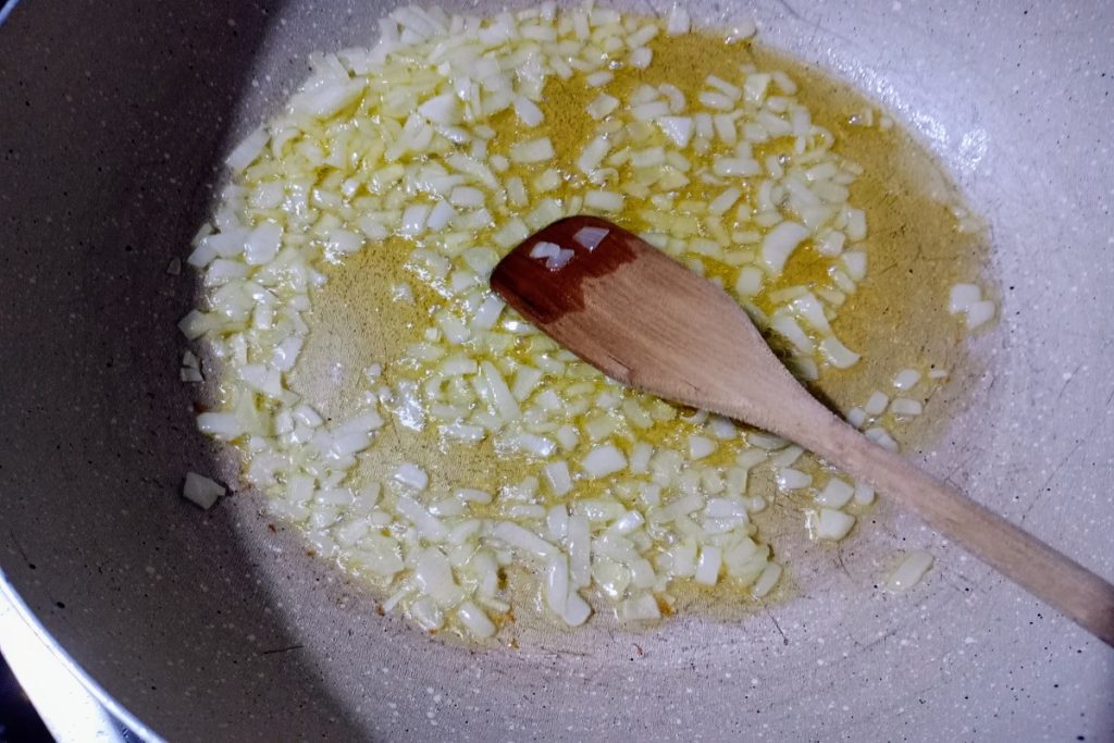 Hachons l’oignon et mettons-le dans une poêle, ajoutons l’huile et laissons dorer doucement.
