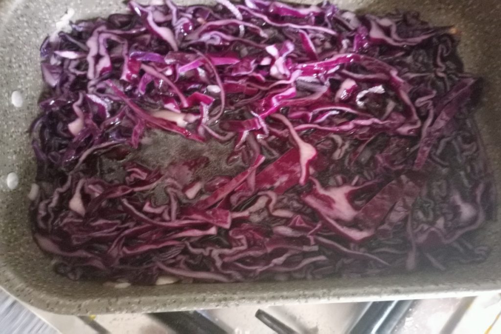 Nous ajoutons le chou rouge et faisons cuire pendant 5 minutes en remuant souvent.