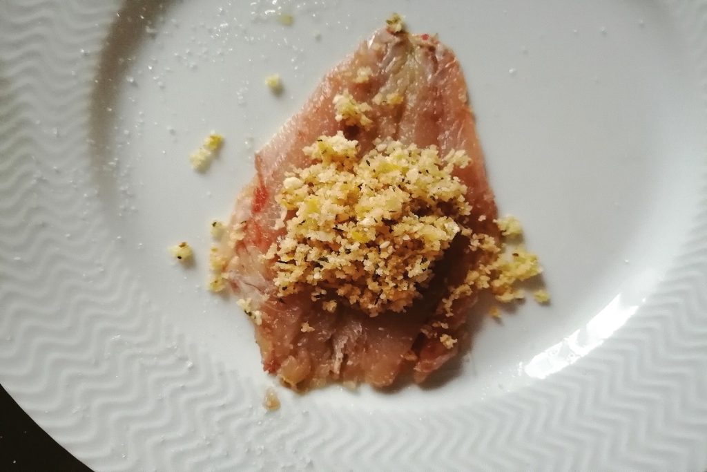 • Sur chaque filet de rouget, versez un peu de mie aromatisée, roulez.