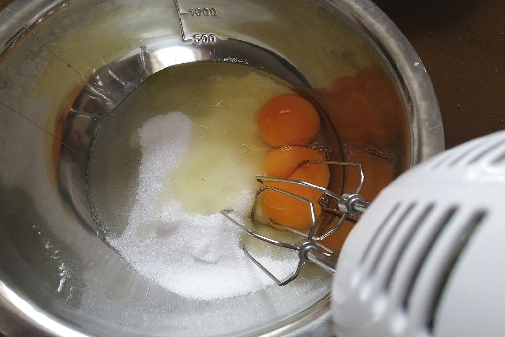 Dans un saladier, versez l’érythritol et les œufs, battez au fouet jusqu’à ce qu’ils deviennent clairs et mousseux.