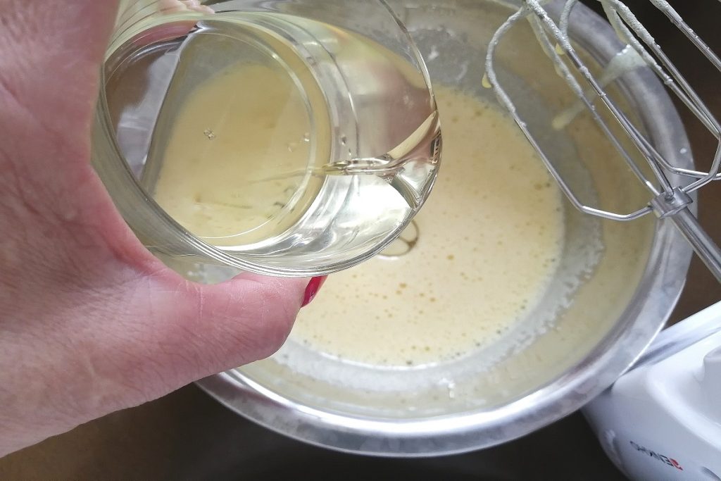 Ajoutez l’huile de tournesol, le jus d’orange dans lequel les tranches de pomme ont mariné, puis incorporez la farine petit à petit en battant.