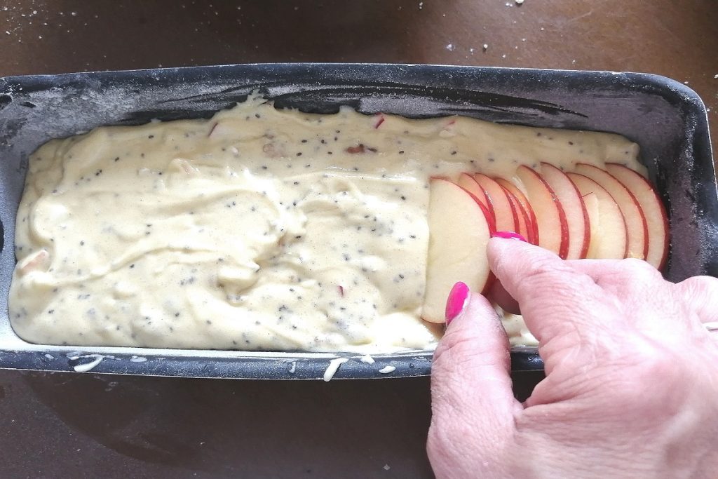 Versez la préparation dans un moule à cake beurré et fariné, disposez les tranches de pomme sur le dessus.