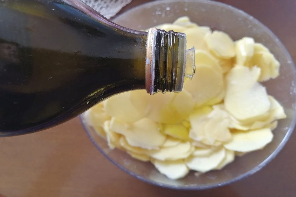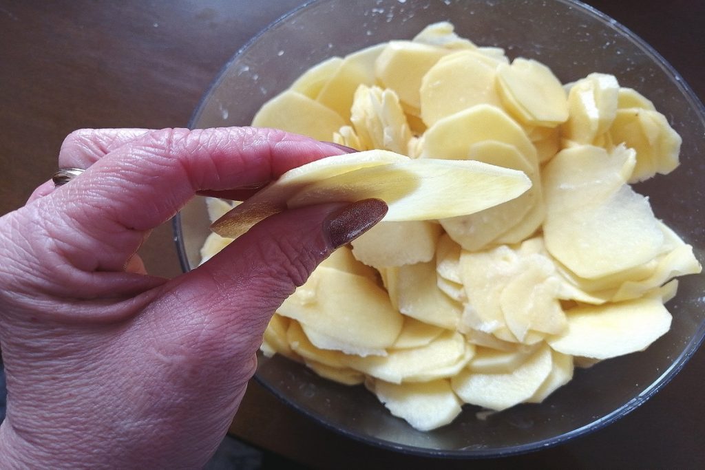 • Épluchez et lavez les pommes de terre, puis taillez-les finement à la mandoline.