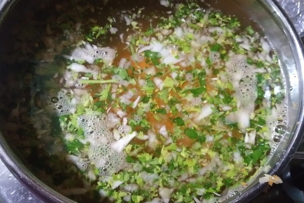 Ajoutons le mélange de légumes, puis lavons et coupons les tomates cerises en quatre et ajoutons-les dans la casserole, portons à ébullition.