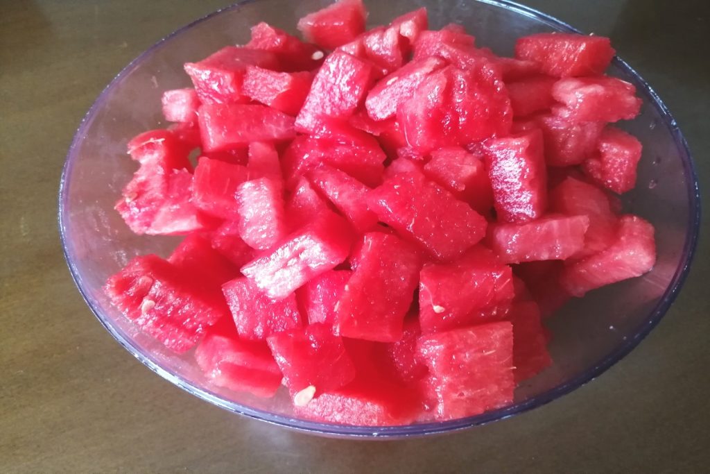 Enlevons l’écorce et les pépins de la pastèque et coupons-la en cubes, puis mettons-la dans une passoire avec un récipient en dessous pour faire perdre du liquide.