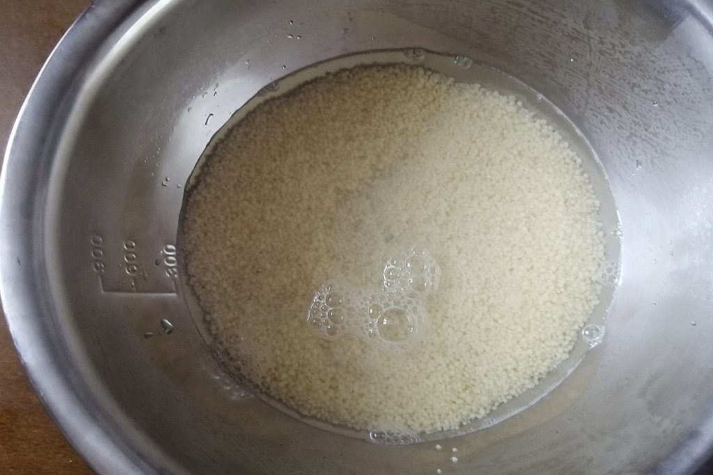 Lorsque le couscous a absorbé l’eau, commencez à égrainer les grains avec une fourchette.