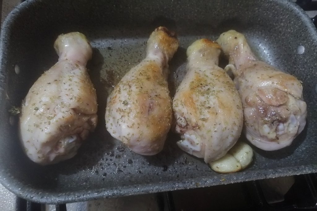 Passons à la préparation du poulet en versant l’huile EVO et la gousse d’ail, ajoutons les cuisses de poulet nettoyées de leur peau.