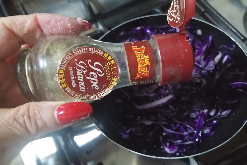 Ajoutez le chou rouge et faites sauter pendant 4/5 minutes en remuant souvent.